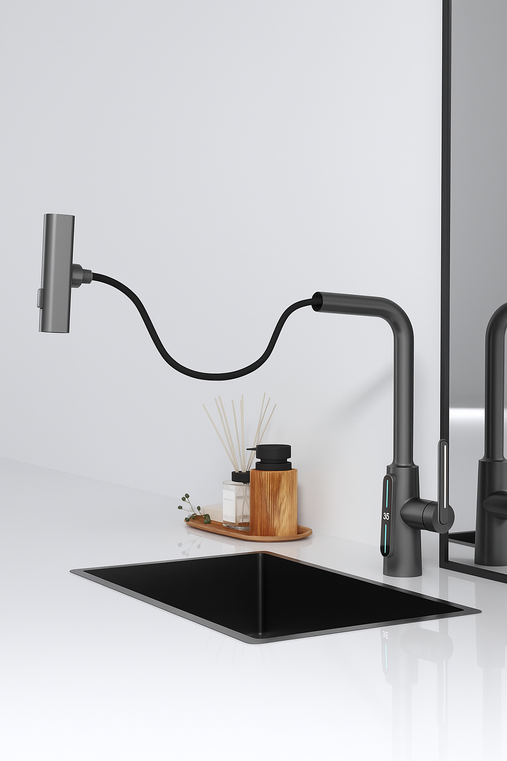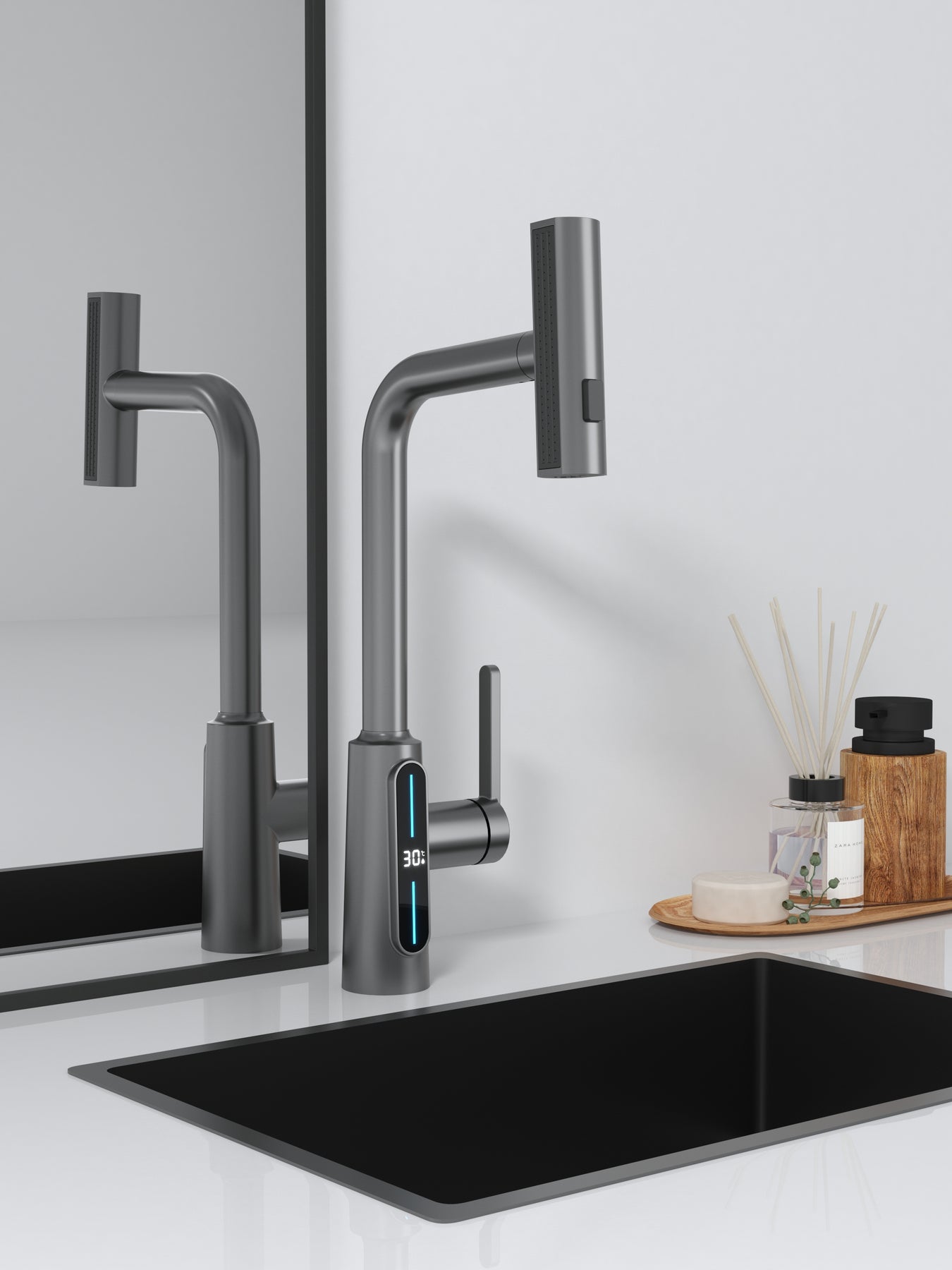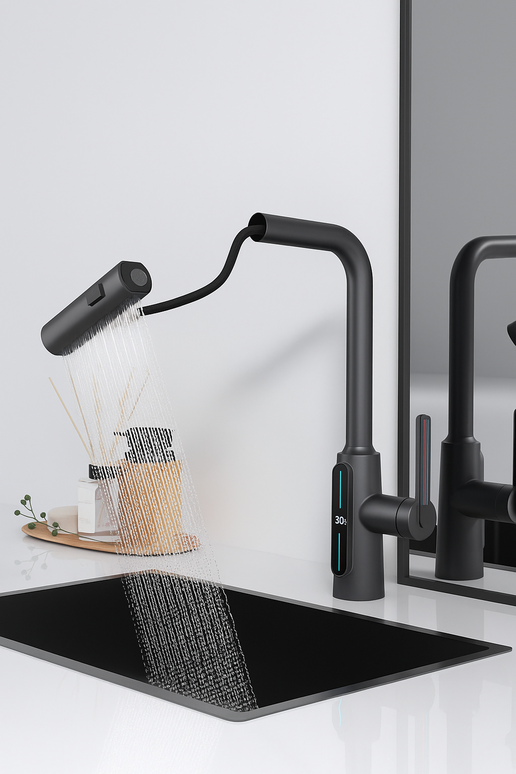 Discover next-generation kitchen innovation with Lumino. Designed for those who value both form and function, this smart faucet combines sleek gunmetal aesthetics with responsive digital tech—enhancing your kitchen with elegance, intelligence, and control.